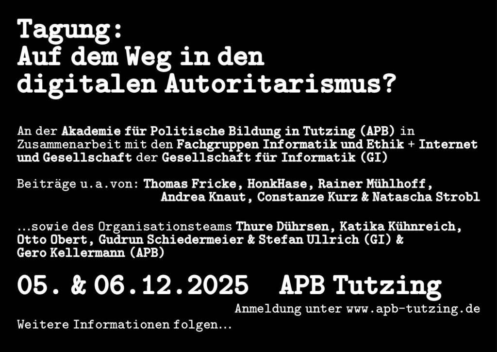 Die Akademie für Politische Bildung in Tutzing (APB) organisiert in Zusammenarbeit mit den Fachgruppen Informatik und Ethik und Internet und Gesellschaft der Gesellschaft für Informatik (GI) die Tagung am 05. & 06.12.2025